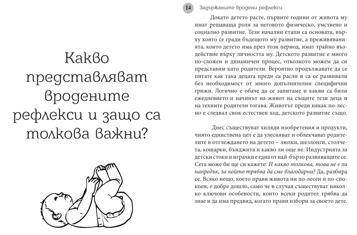 Книгата предоставя подробна и достъпно обяснена информация за това, какво са вродените рефлекси, как те се отразяват на развитието на детето, до какви проблеми може да доведе тяхното задържане. В книгата ще откриете и работещи стратегии за това, как да помогнете на вашето дете да преодолее своите задържани рефлекси и да се справи с трудностите, които изпитва.